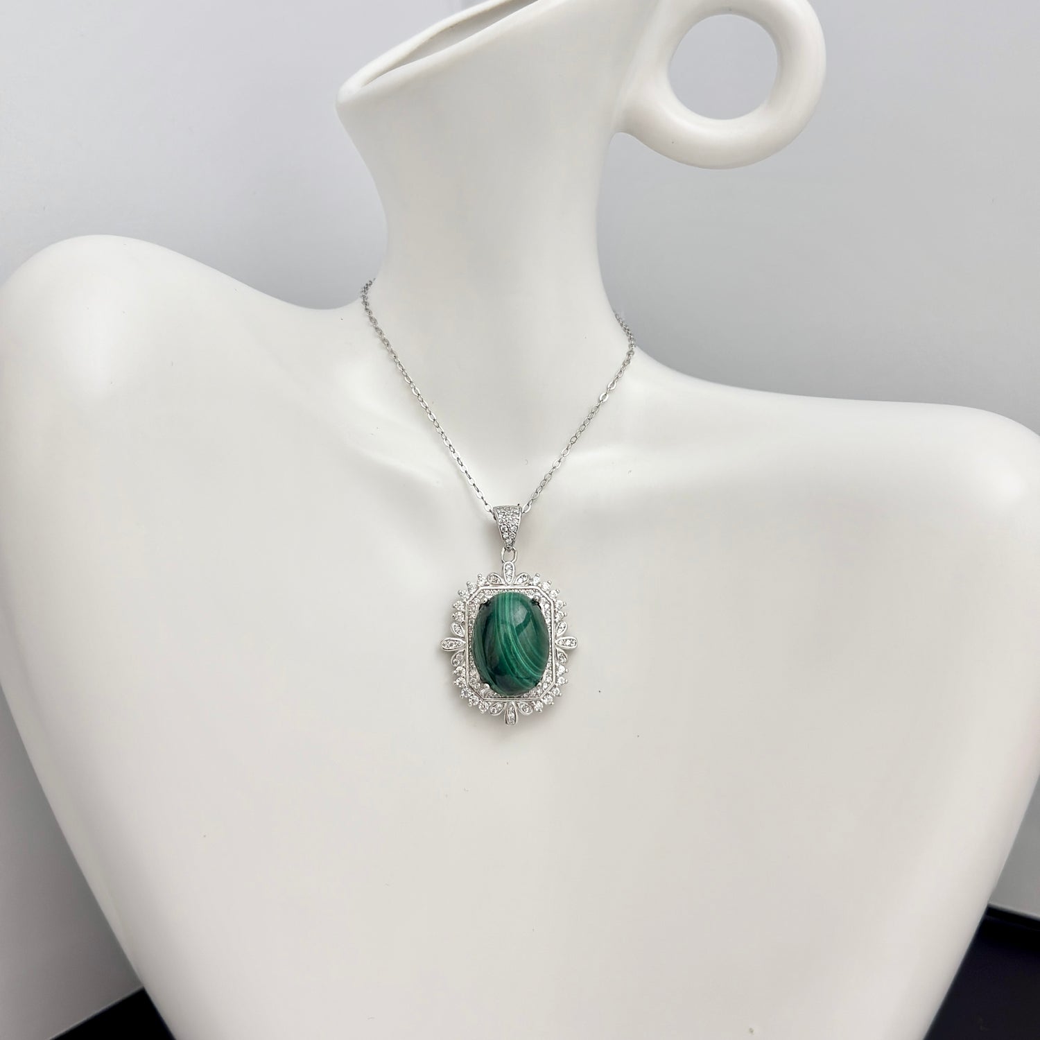 A deep, rich green hue dances gracefully at the neckline. The intricate patterns of malachite resemble a miniature painting of nature, exuding an air of mystery and elegance. Wearing it, one feels as if they are standing in a serene forest, their mind finding solace in its tranquility.