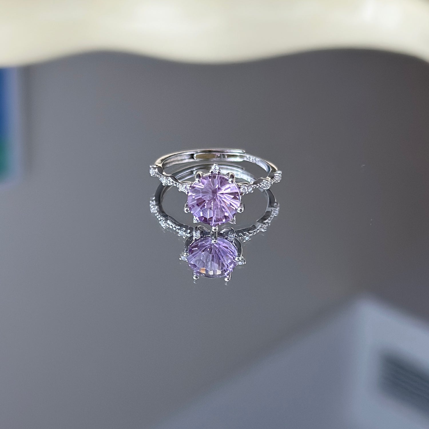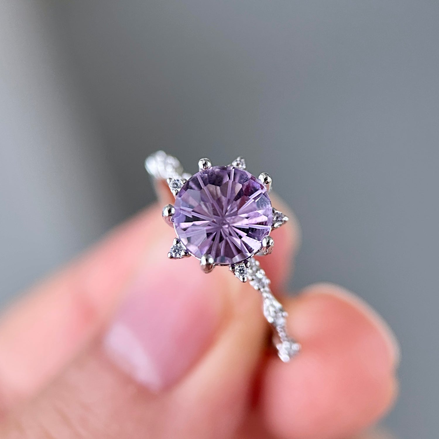 The dream-like violet color evokes feelings of tranquility and royalty, reminiscent of a peaceful night sky or a romantic lavender field. The amethyst has been expertly faceted, transforming it into a multifaceted gem that resembles a blooming firework. Each facet acts like a tiny mirror, reflecting a radiant spectrum of colors. The result is a gemstone of unparalleled beauty.