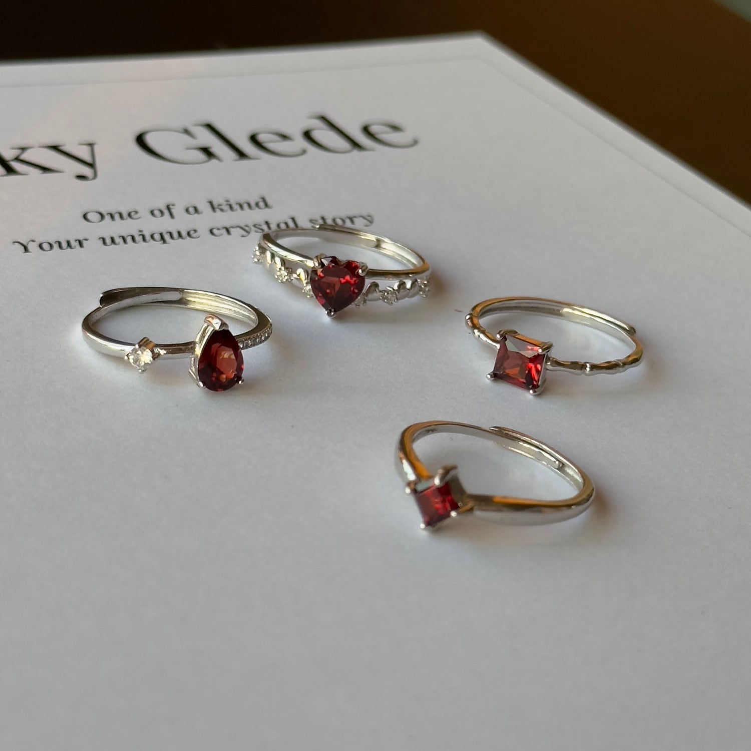 The garnet, a fiery heart of stone, pulsates with life force. Its deep red hue, reminiscent of a passionate flame, symbolizes love and vitality. Wearing a garnet can ignite the soul and inspire courage. Featuring four unique designs - heart-shaped, teardrop, diamond-shaped and square - each ring is a masterpiece crafted with premium Garnet and pure 925 silver. This simple and sophisticated design exudes a luxurious feel, perfect for any occasion.