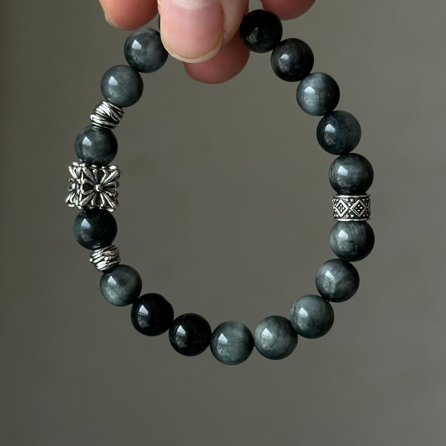 Hawkeye enhances insight, white agate promotes spiritual growth, and jade elevates the spirit. Combined, they help the wearer gain a deeper understanding of themselves, enhance self-awareness, and foster spiritual growth.