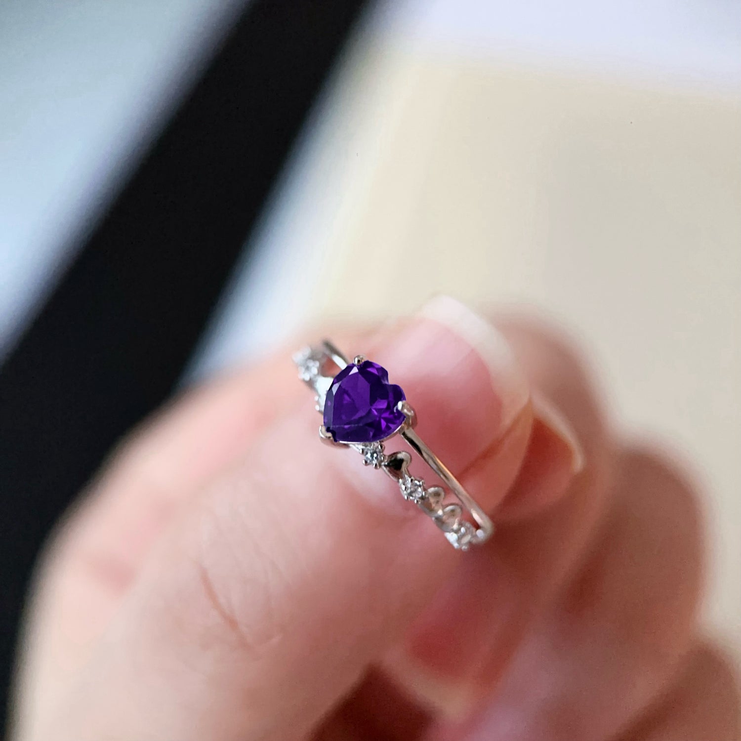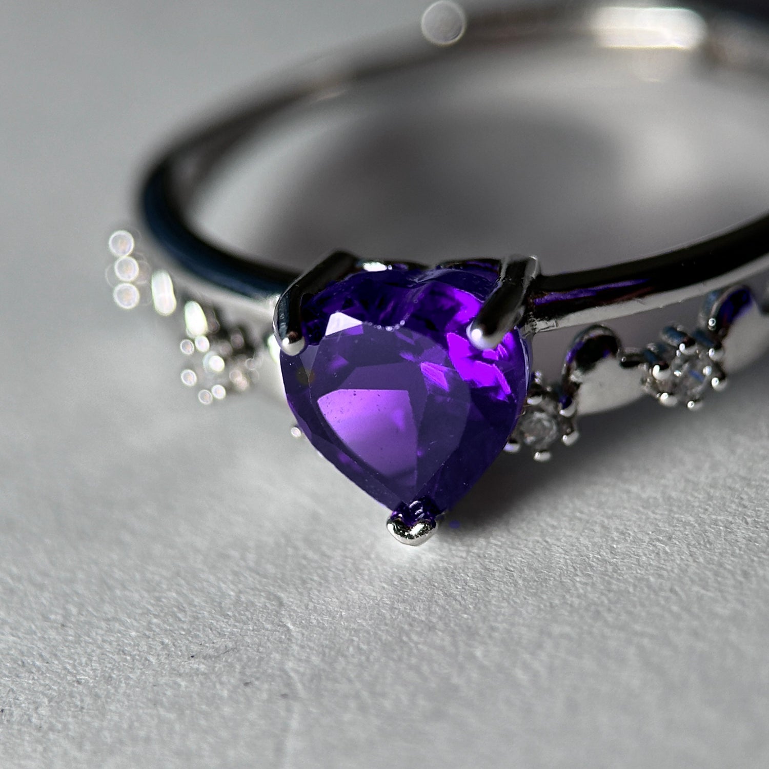 The dream-like violet color evokes feelings of tranquility and royalty, reminiscent of a peaceful night sky or a romantic lavender field. A heart-shaped silver ring is a love letter worn on the finger, symbolizing purity, eternal love, and making a perfect gift for those you cherish.
