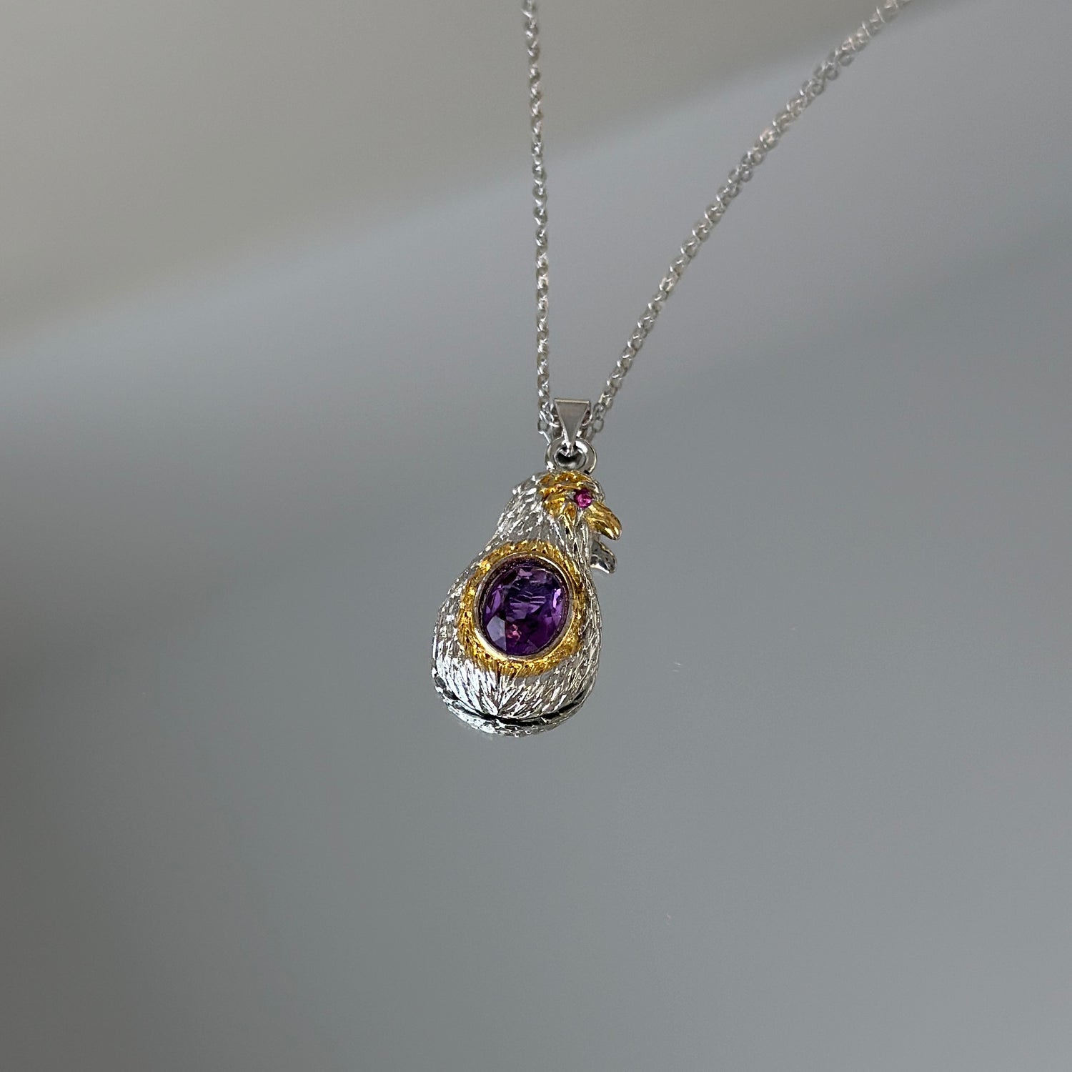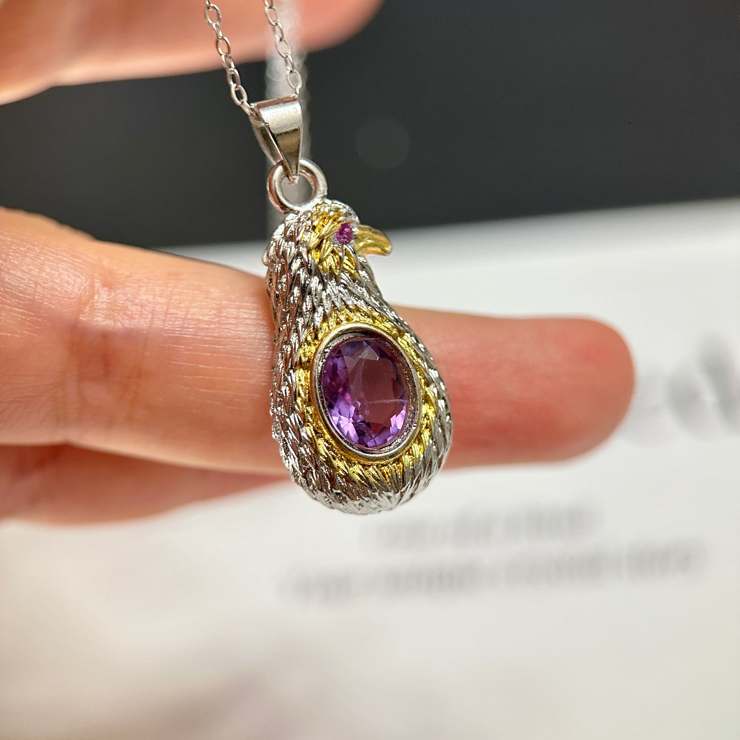 Introducing the Lucky Eagle: Natural Amethyst Necklace. This elegant necklace features a multi-faceted natural amethyst pendant, set in a beautifully crafted, adorable eagle. In Western culture, the eagle is a symbol of freedom, strength, and courage. A mystical gift from the night sky, amethyst's deep purple hue resembles a serene, deep lake filled with endless mysteries. It is a symbol of wisdom, peace, and love, a protector of the soul, making this necklace the perfect accessory for any strong, free-spirited individual.