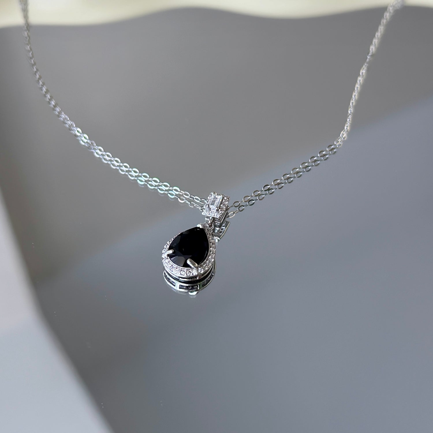 This Natural Black Spinel Silver Necklace features a beautifully cut teardrop-shaped black spinel center, accentuating its unique shape.