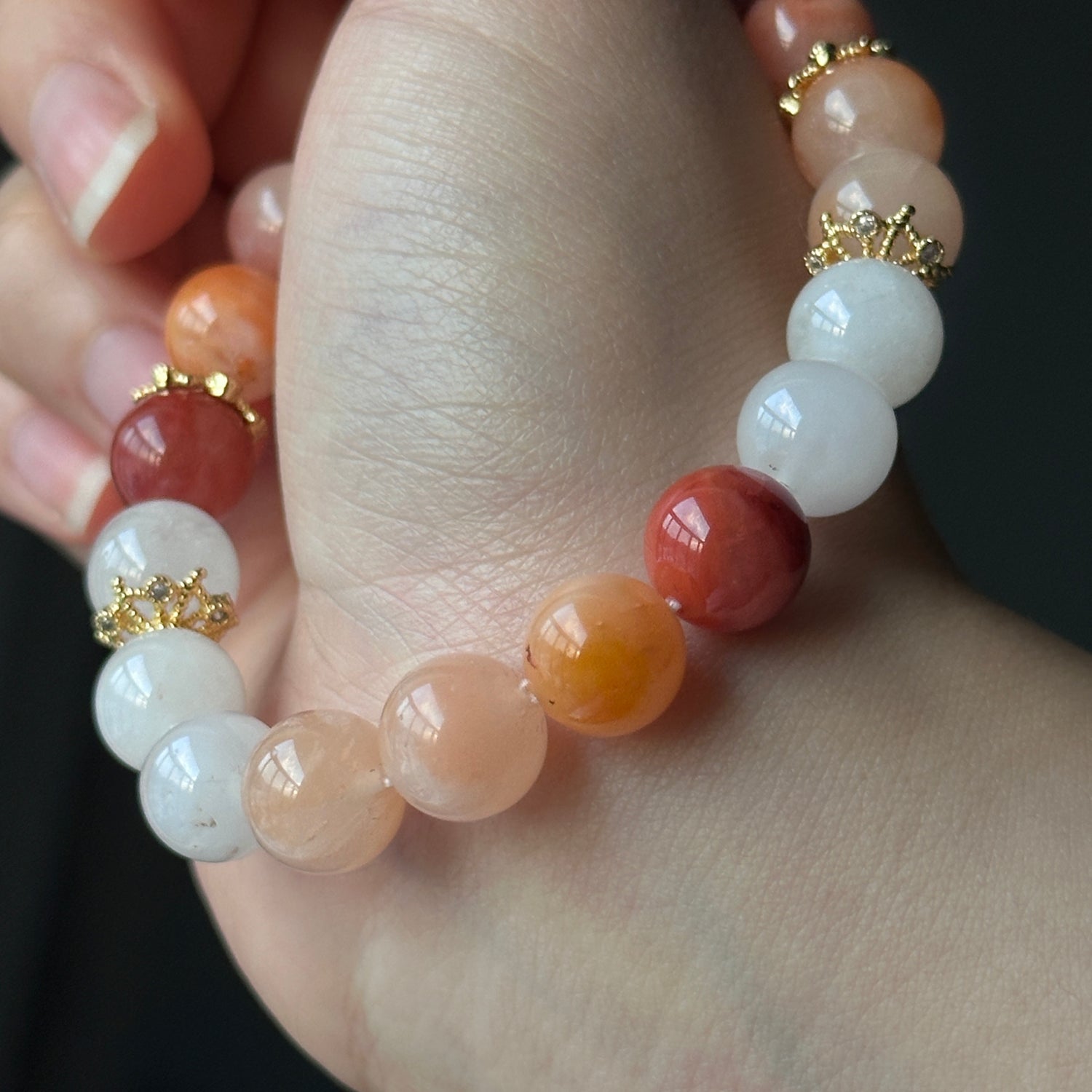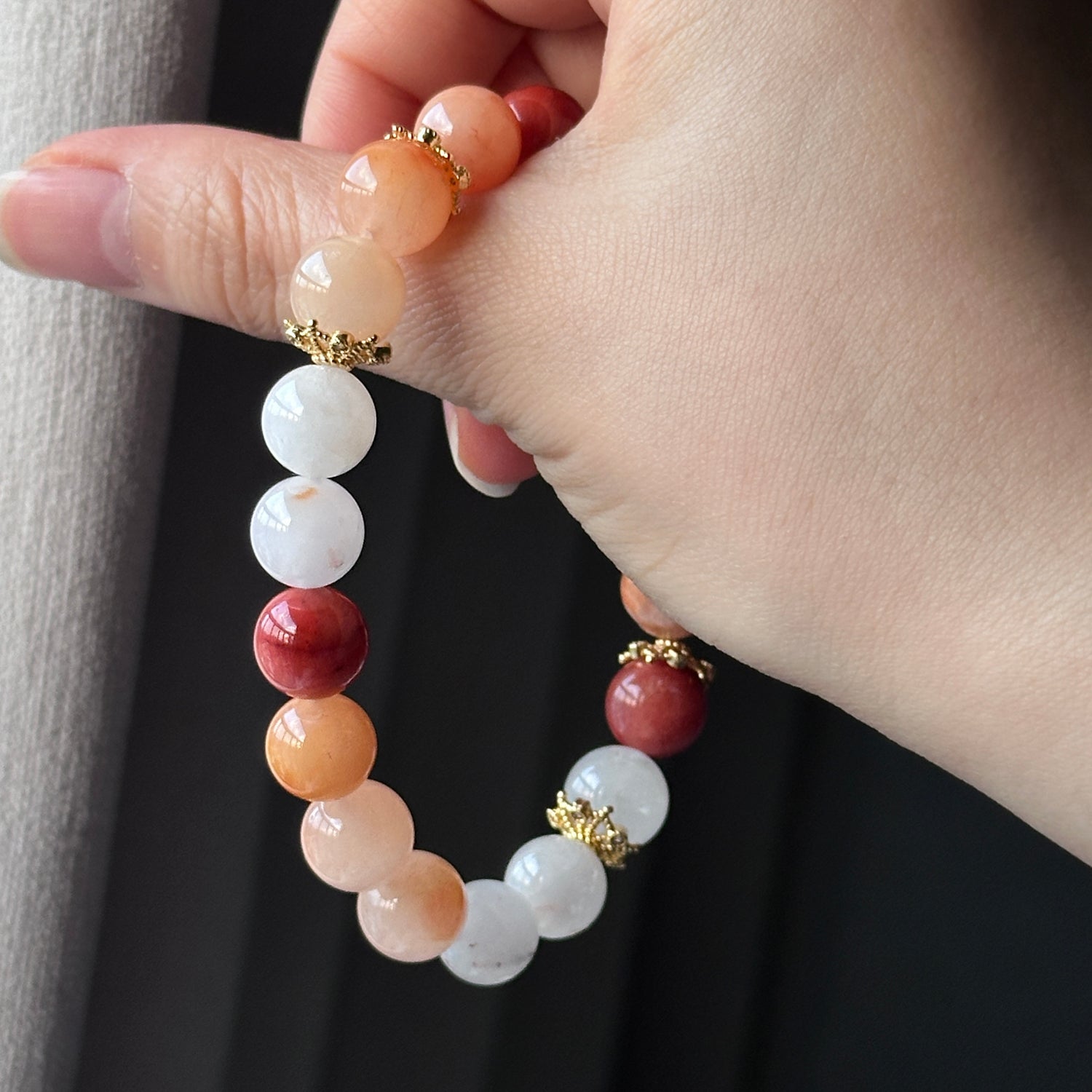 The gradient rabbit fur crystal is deeply loved by crystal lovers for its unique visual effects and powerful energy. Its color transition is natural, as colorful as a rainbow, giving people a dreamy feeling. The color of this bracelet gradually deepens from white to a bright red. Like the morning glow, it turns from white to red and dyes the sky red.