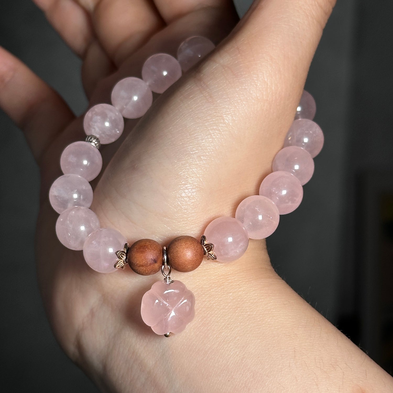 This pink quartz bracelet, paired with sandalwood beads, exudes a subtle and calming sandalwood fragrance. The pendant is shaped like a four-leaf clover, symbolizing luck and happiness. Pink quartz is a gentle gemstone that can help relieve stress and anxiety, promoting inner peace and tranquility. Sandalwood, a precious wood, offers a rich aroma and soothing properties. The four-leaf clover, a rare botanical find, is considered a symbol of good fortune.