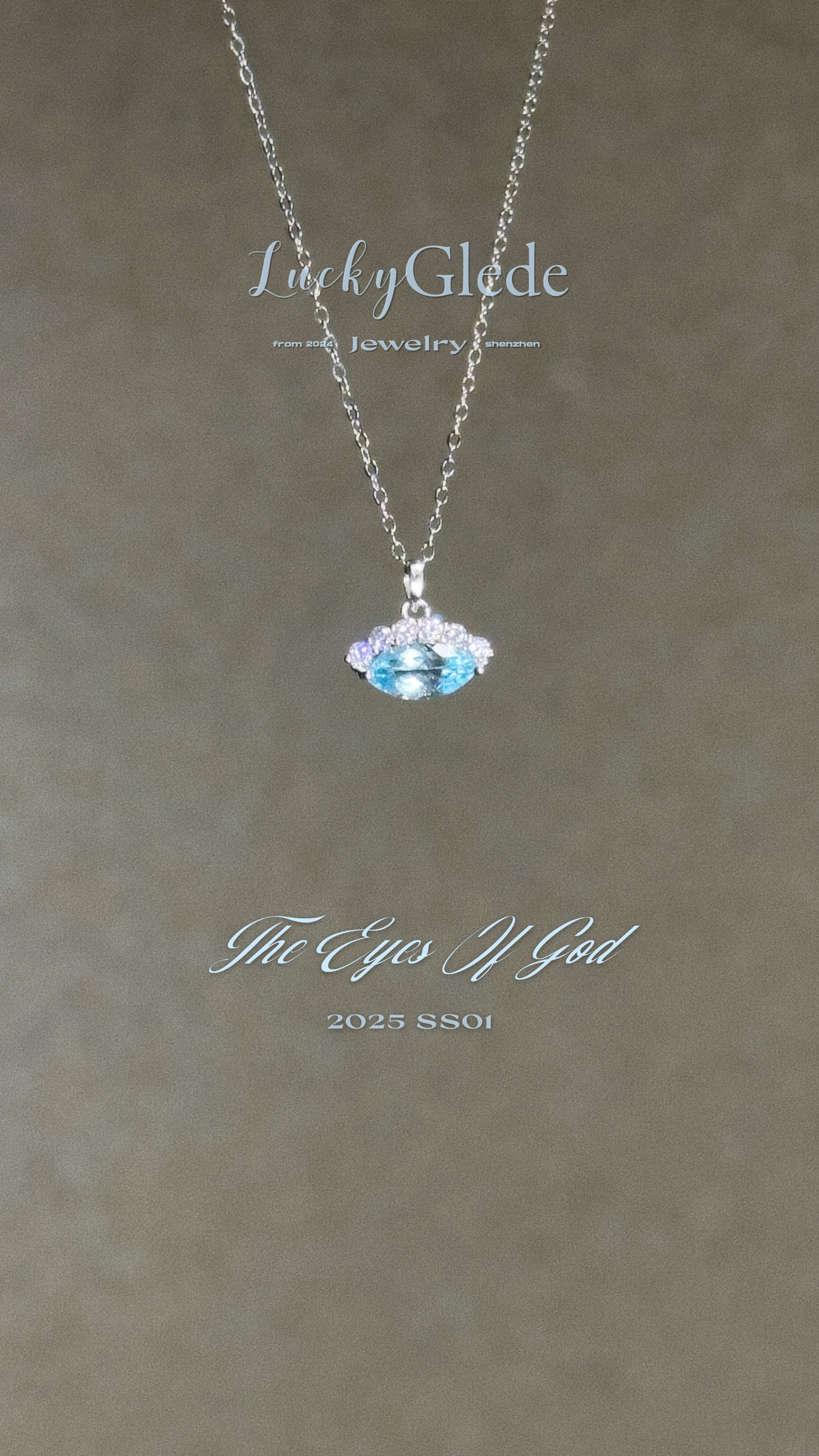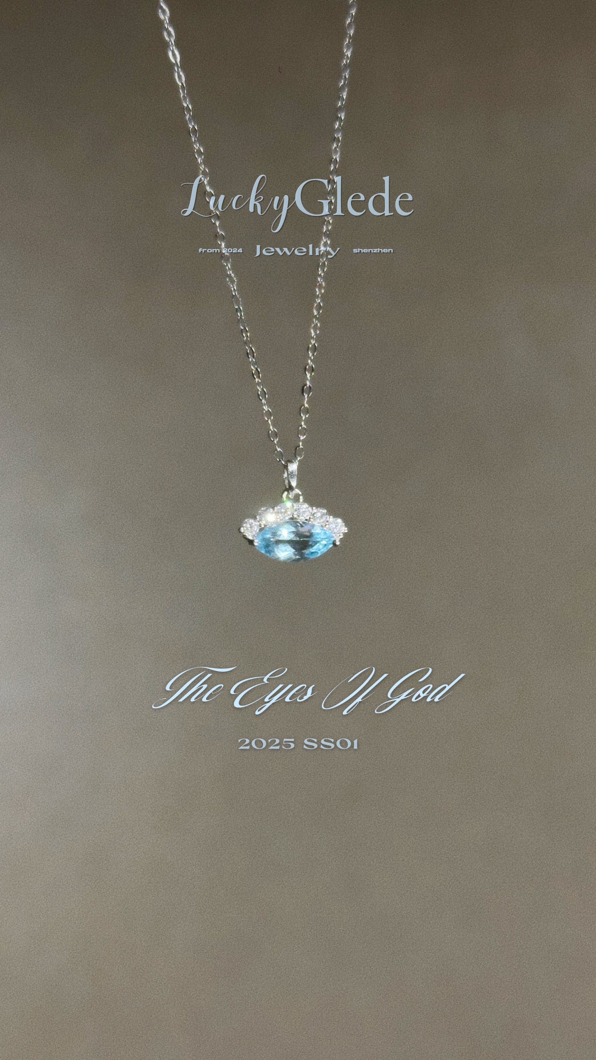 This exquisite necklace is a testament to the beauty and power of nature. The centerpiece is a large, faceted topaz stone, cut in the shape of an eye. The topaz is a deep, rich blue, reminiscent of the color of the ocean. Surrounding the topaz are a circle of tiny white zircon, like eyelashes, adding a touch of sparkle and elegance.