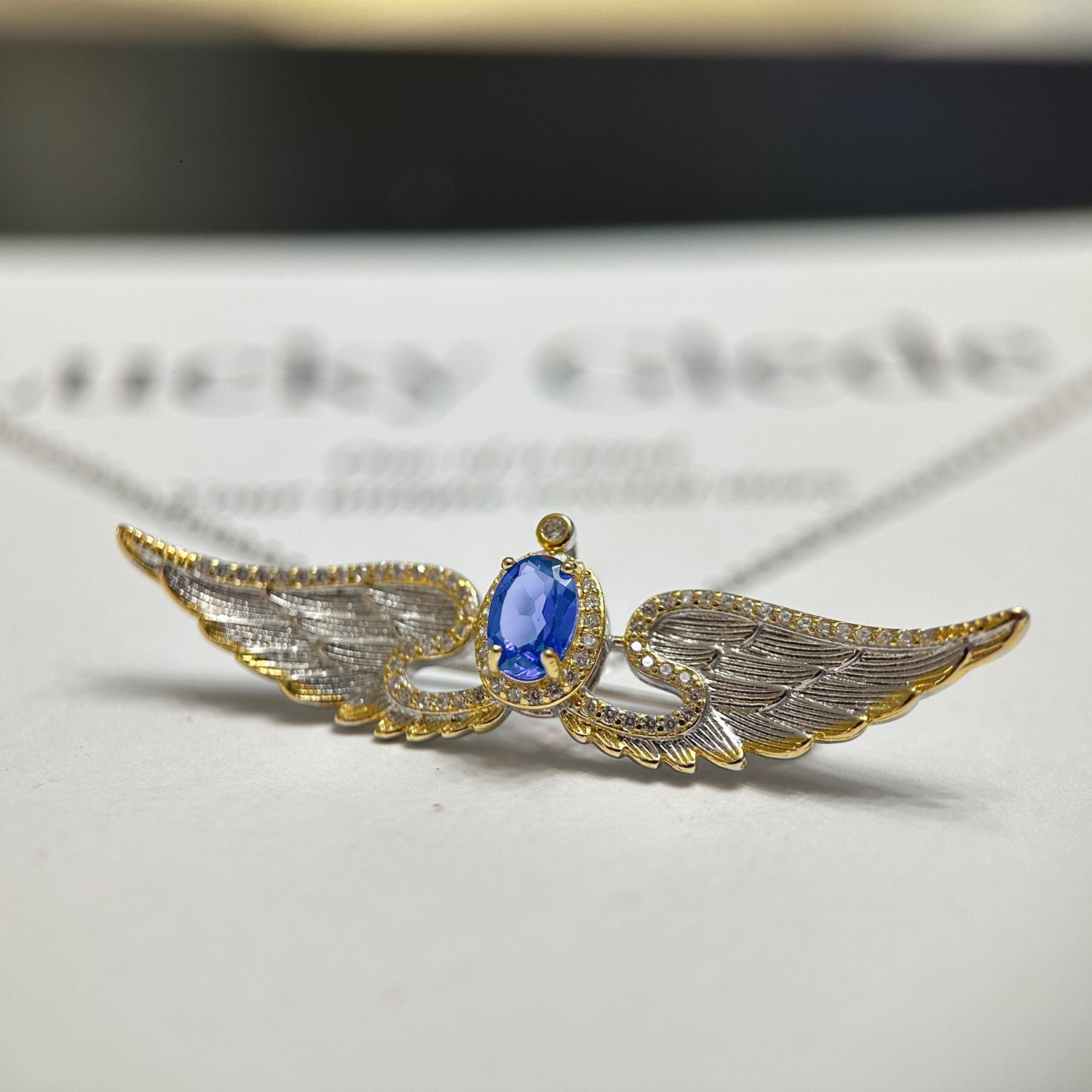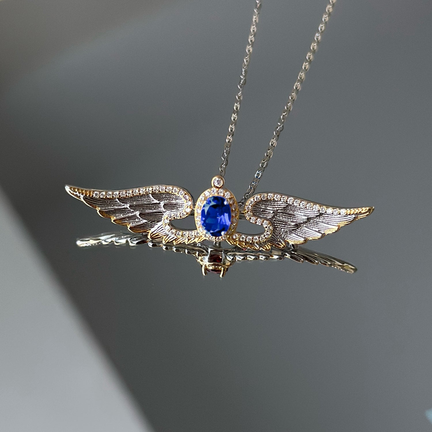 With its deep blue sapphire and graceful silver wings, this necklace is a testament to the beauty of nature. The sapphire, a symbol of wisdom and serenity, brings a sense of calm to the wearer. The wings, representing freedom and aspirations, inspire one to reach for the stars.